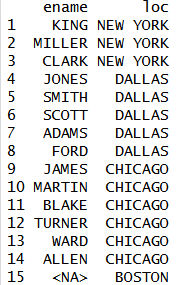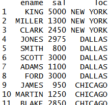 merge(emp, dept, by='deptno')[, c('ename', 'sal', 'loc')]