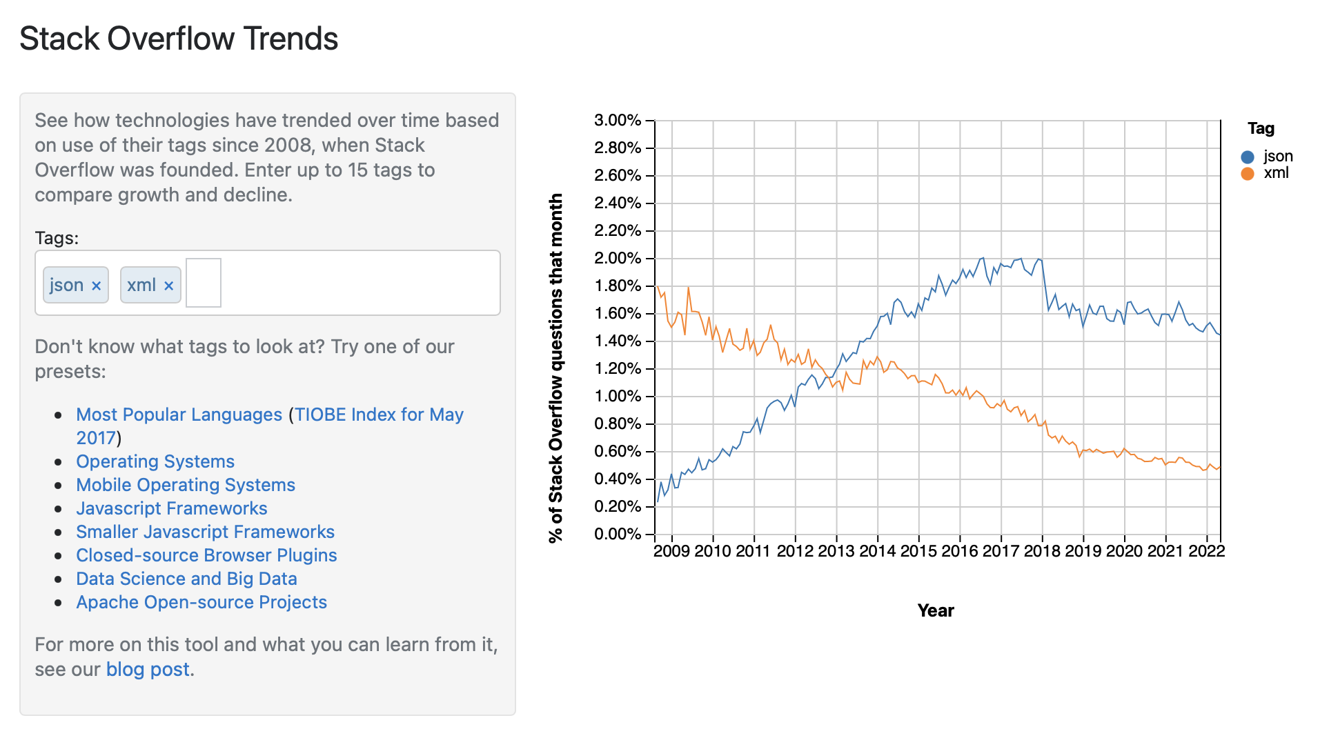 많이 쓰여왔던 두가지 포맷인 JSON과 XML의 트랜드를 보여준다.