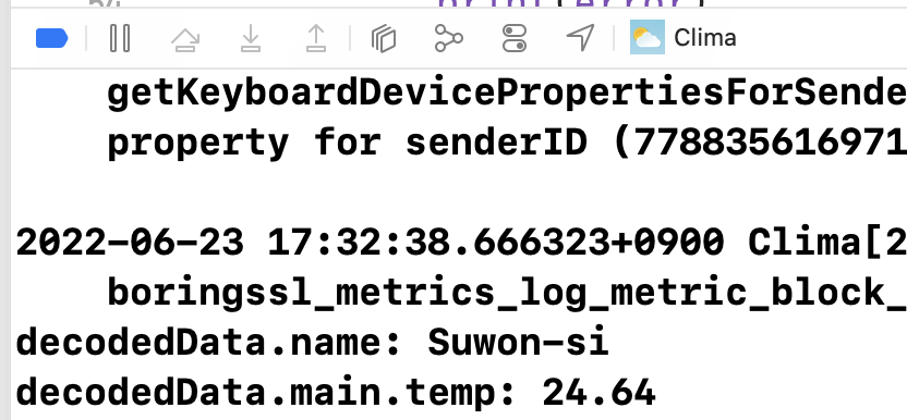 | func parseJSON(weatherData: Data) { let decoder = JSONDecoder() do{ let decodedData = trydecoder.decode(WeatherData.self, from: weatherData) print("decodedData.name: \(decodedData.name)") print("decodedData.main.temp: \(decodedData.main.temp)") print("decodedData.weather[0].description: \(decodedData.weather[0].description)") } catch{ print(error) } } |