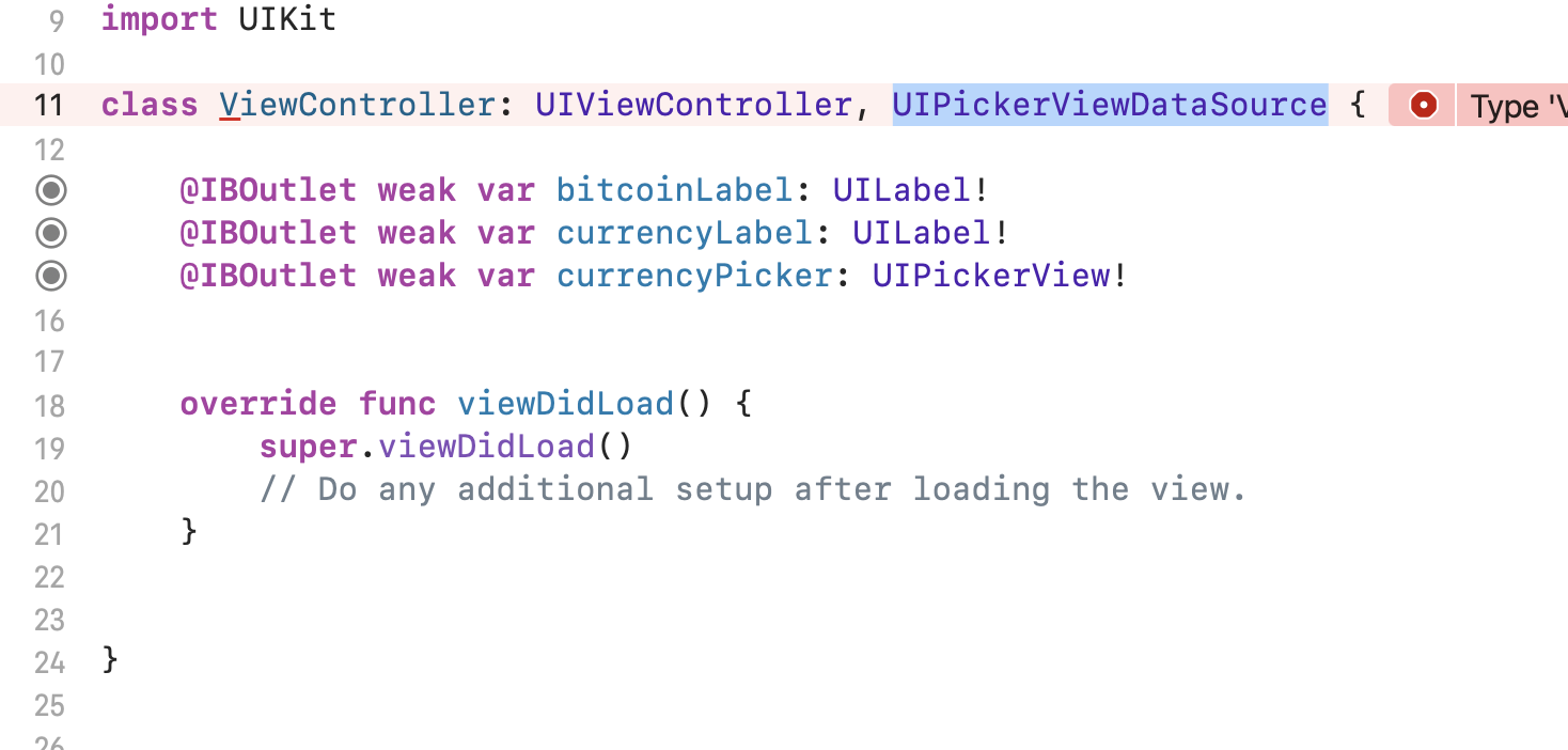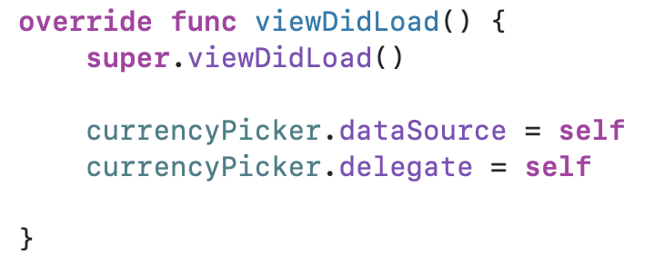 | override func viewDidLoad() { super.viewDidLoad() currencyPicker.dataSource = self } |