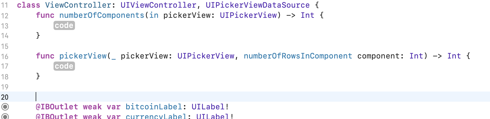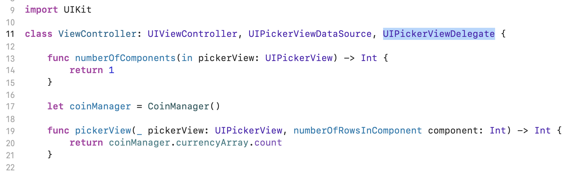 | let coinManager = CoinManager() func pickerView(_pickerView: UIPickerView, numberOfRowsInComponentcomponent: Int) -> Int{ return coinManager.currencyArray.count } |