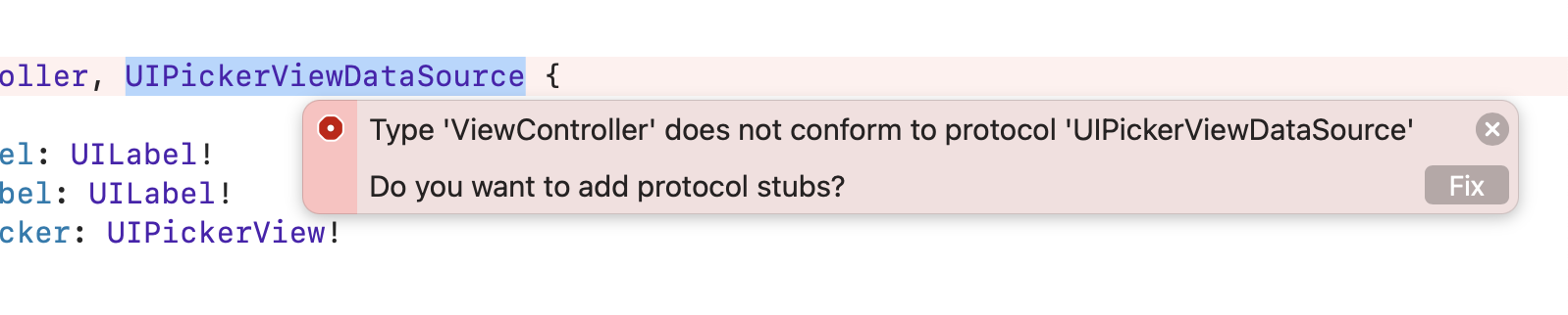 'UIPickerViewDataSource' 프로토콜을 추가해준다.