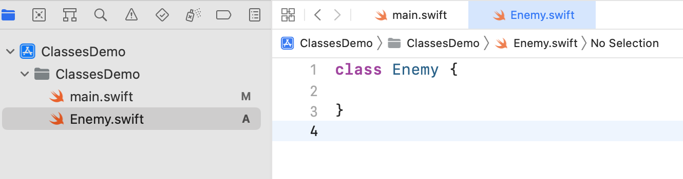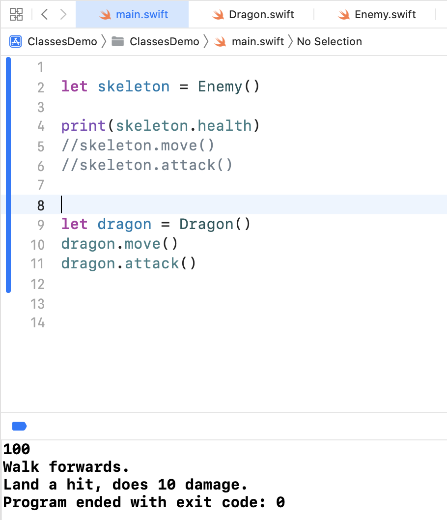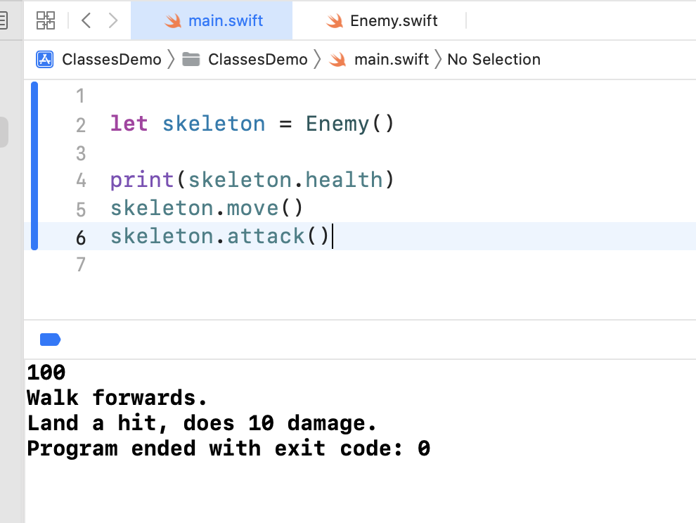 | class Enemy { // properties var health= 100 var damage= 10 // functions (methods) func move() { print("Walk forwards.") } func attack() { print("Land a hit, does \(damage)damage.") } } |