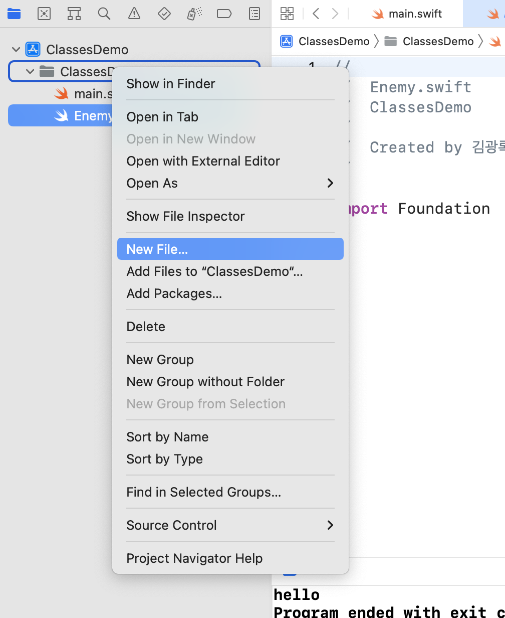 좌상단에 네비게이터에서 해당 폴더를 우클릭하여 새로운 swift 파일을 생성한다.