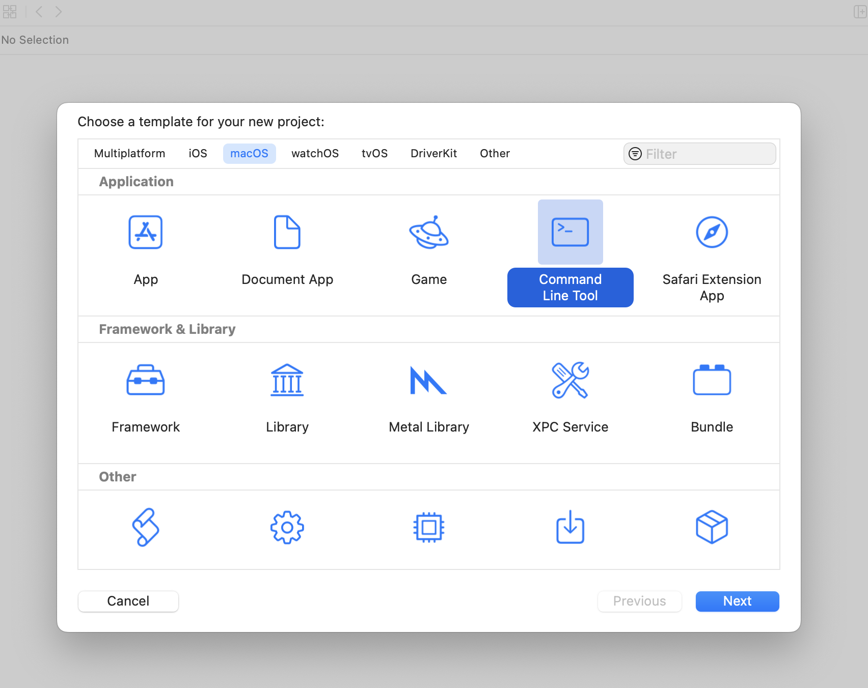 Xcode에서 새 프로젝트 생성하여 macOS 탭에서 Command Line Tool을 선택한다.