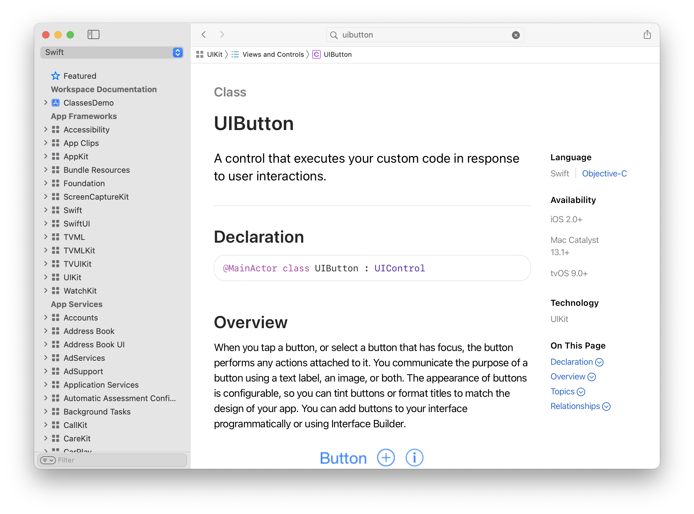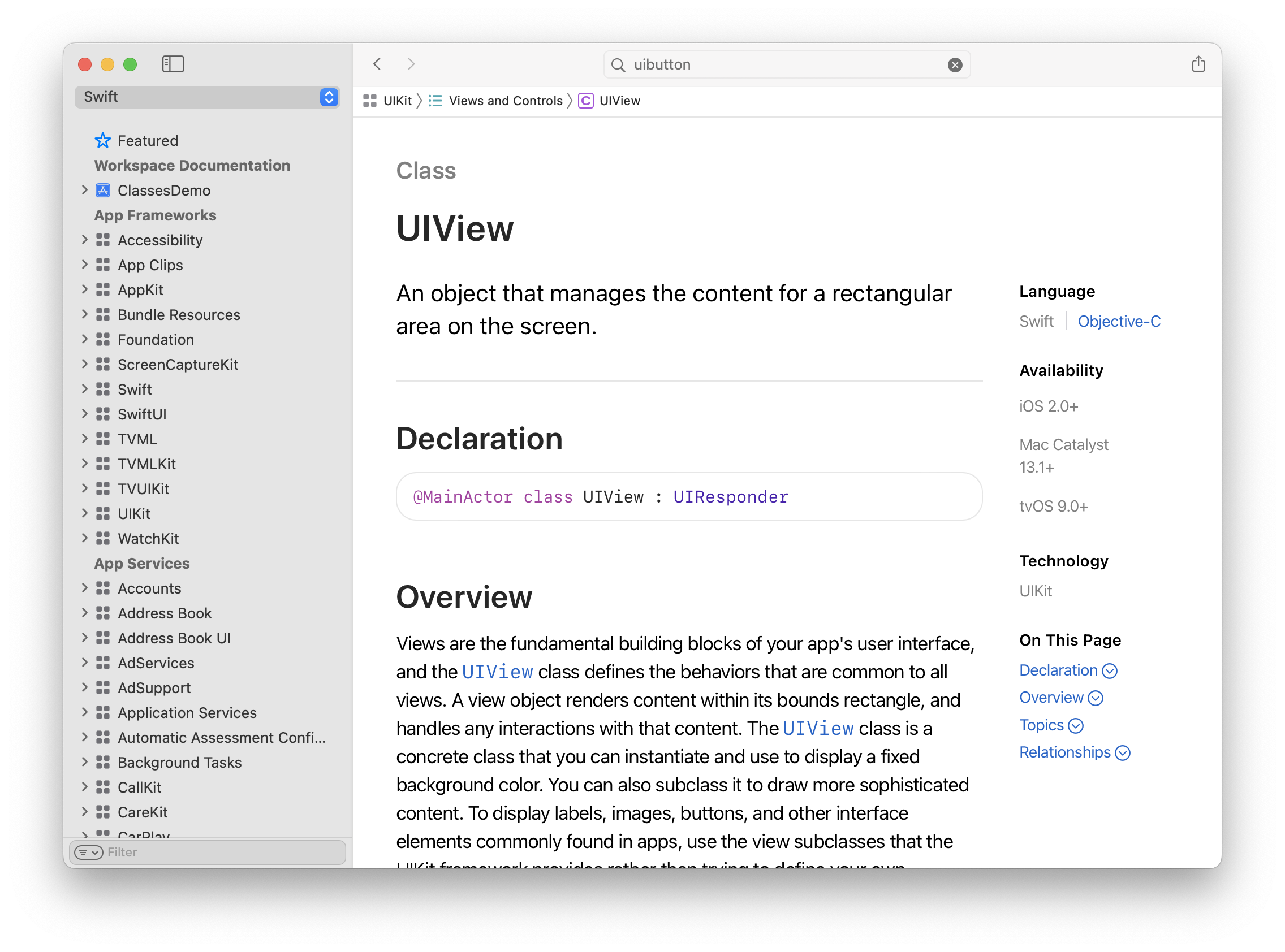 Xcode에 Help 메뉴에서 Developer Documentation를 들어가서