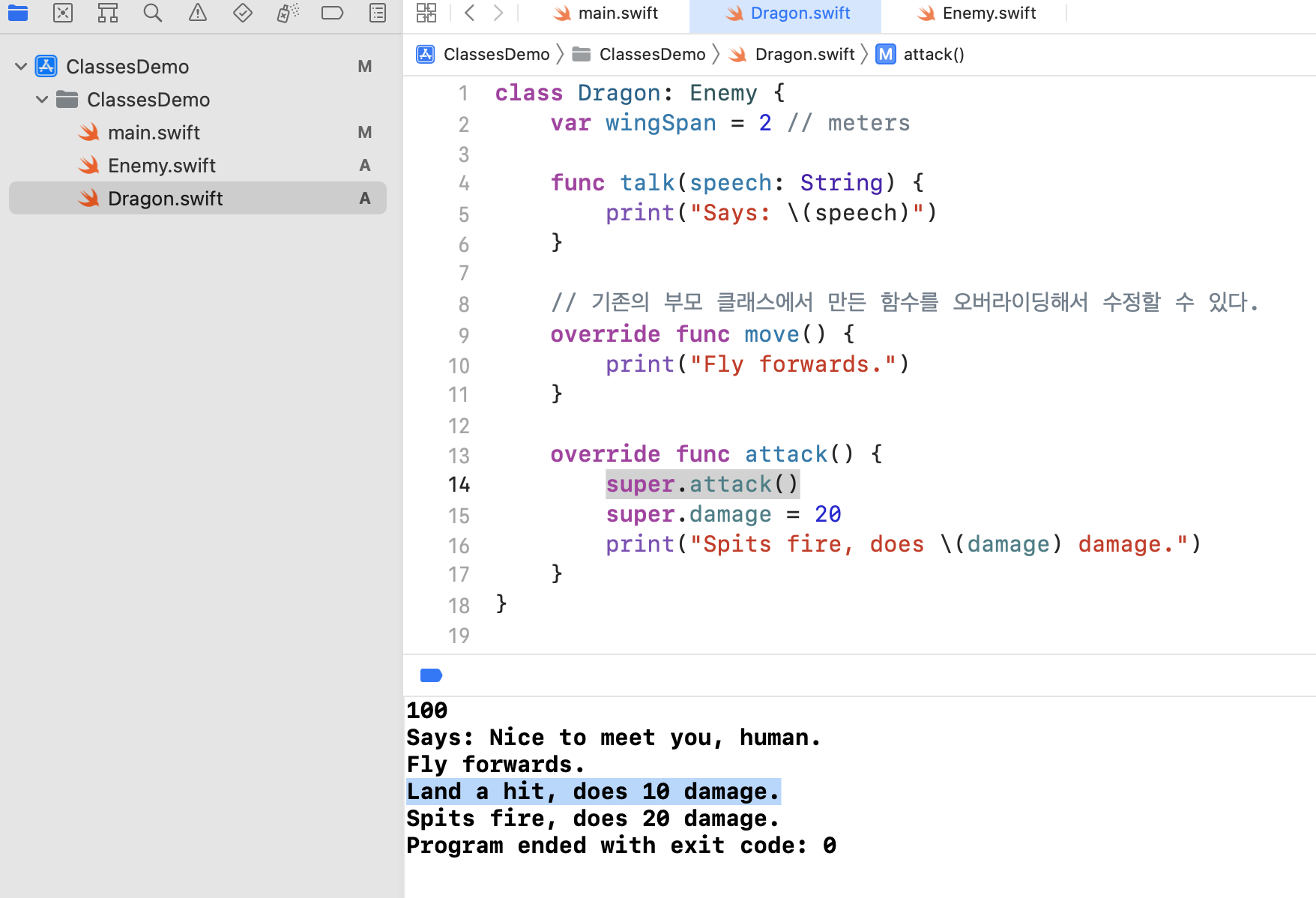 | class Dragon: Enemy { var wingSpan= 2// meters func talk(speech: String) { print("Says: \(speech)") } // 기존의 부모 클래스에서 만든 함수를 오버라이딩해서 수정할 수 있다. override func move() { print("Fly forwards.") } } |