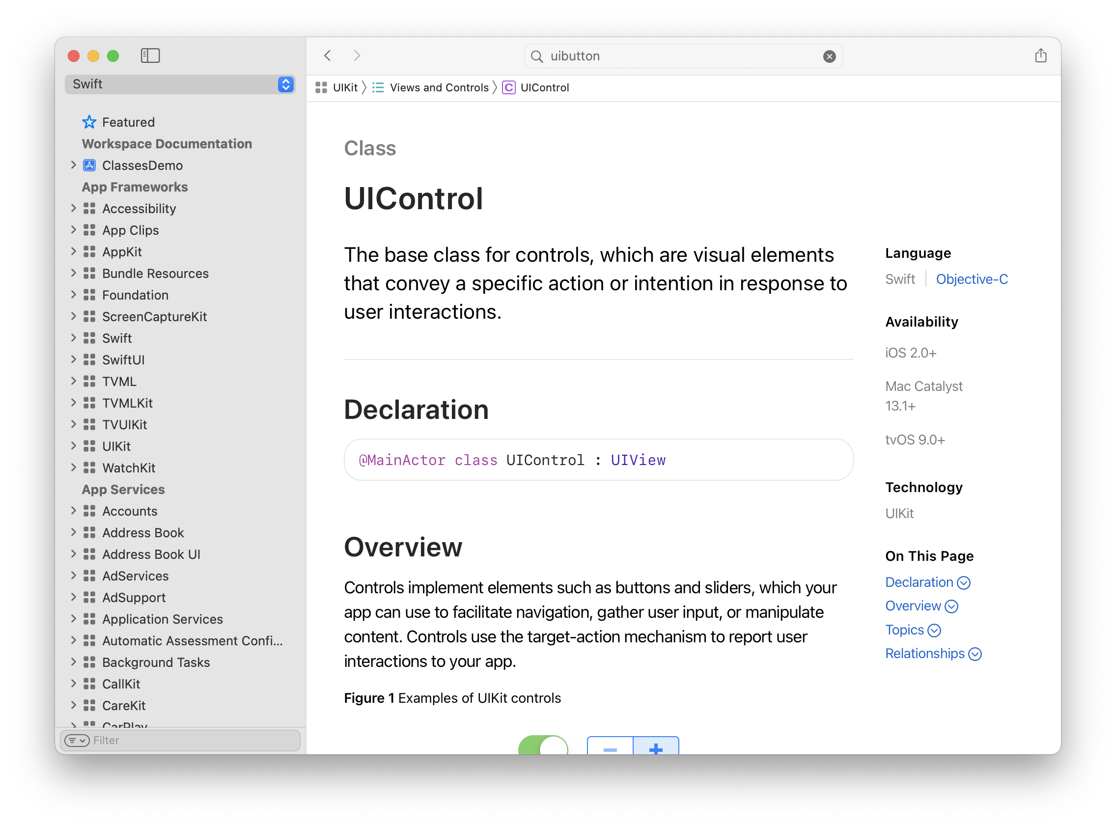 Declaration 아래 UIButton은 UIControl의 상속을 받는다.