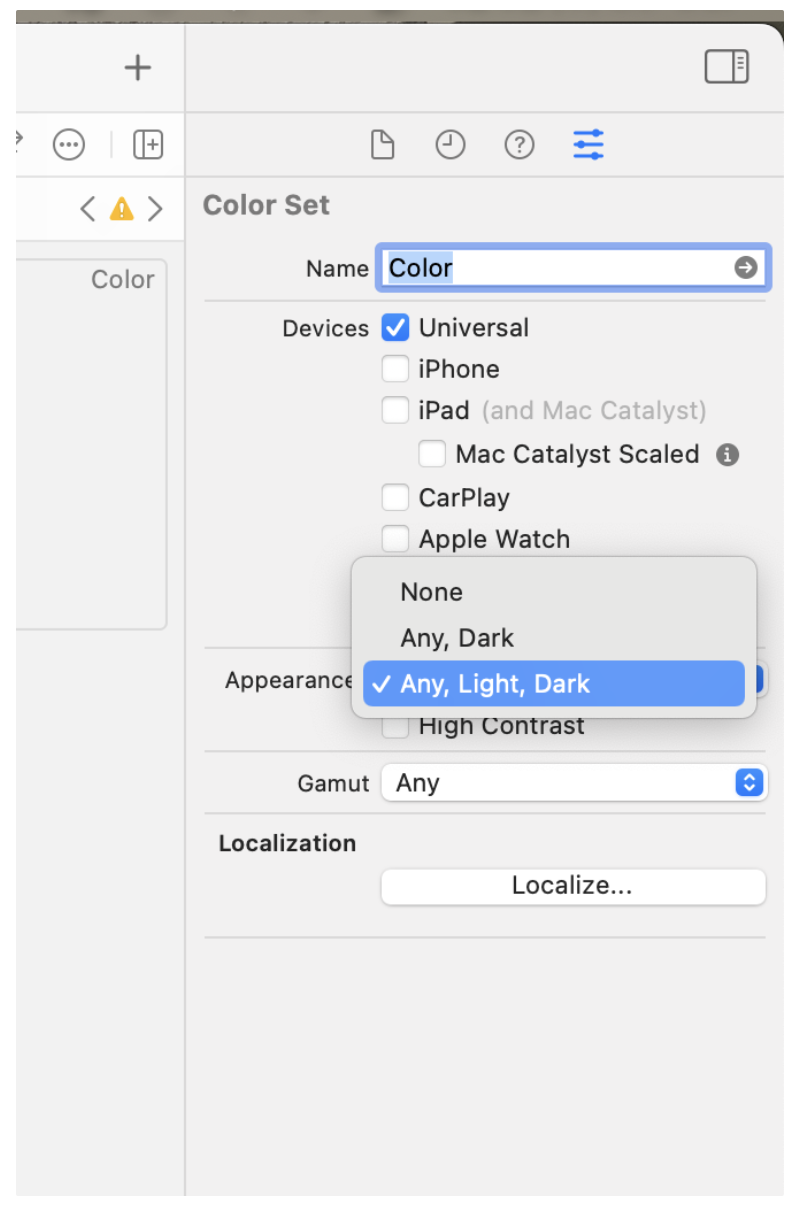 다시 Assets.xcassets 파일로 돌아가서 Any Appearance를 클릭하고