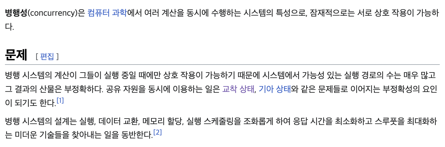 위키백과, 우리 모두의 백과사전. 병행성(concurrency)은 컴퓨터 과학에서 여러 계산을 동시에 수행하는 시스템의 특성으로, 잠재적으로는 서로 상호 작용이 가능하다. 병행 시스템의 계산이 그들