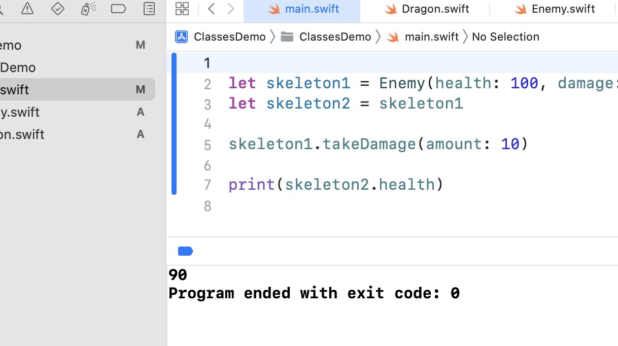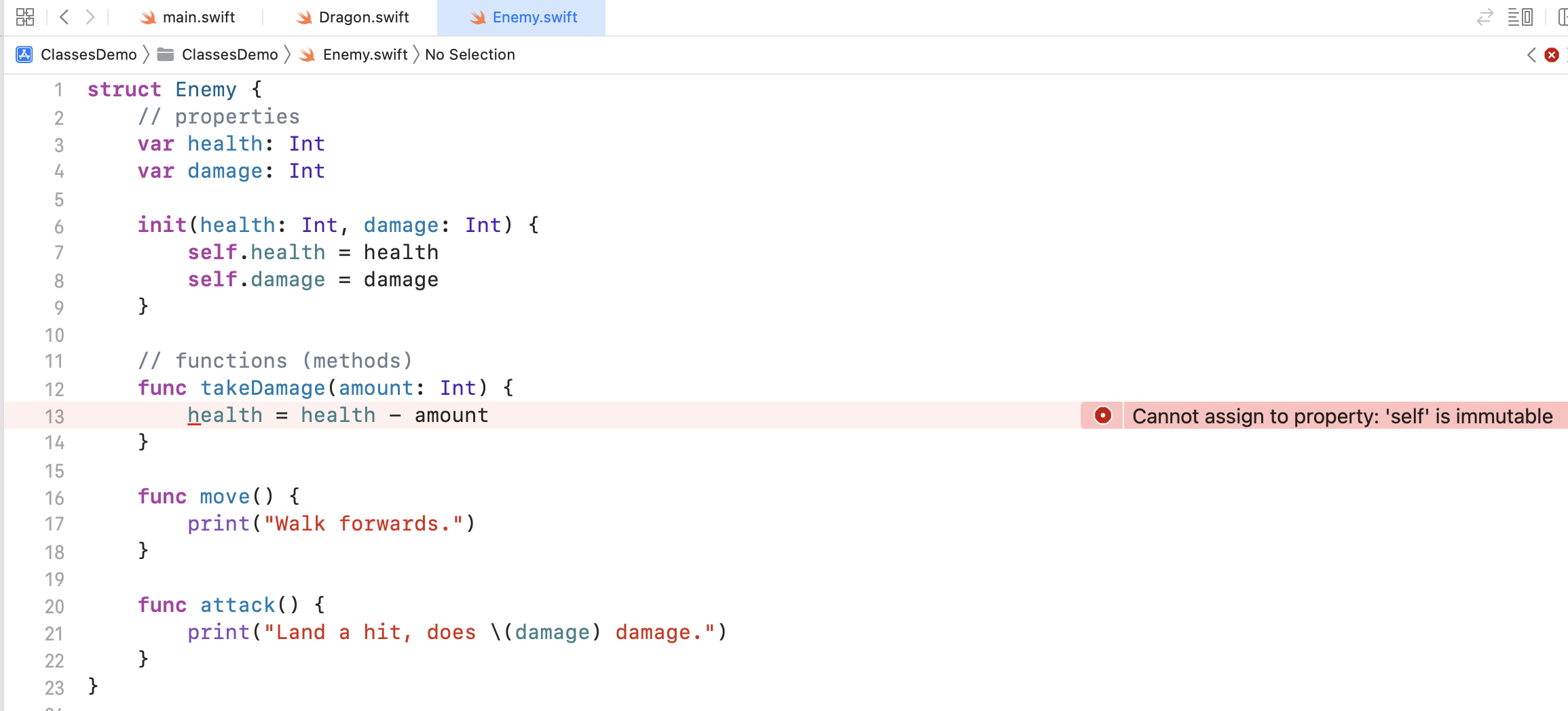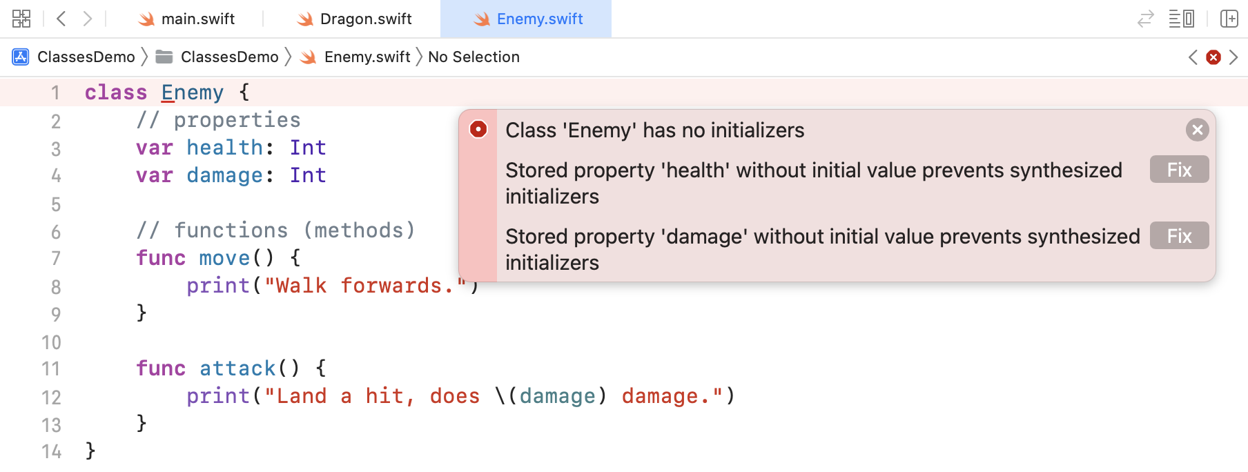 | class Enemy { // properties varhealth: Int vardamage: Int init(health: Int, damage: Int) { self.health= health self.damage= damage } // functions (methods) func takeDamage(amount: Int) { health= health- amount } funcmove() { print("Walk forwards.") } funcattack() { print("Land a hit, does \(damage)damage.") } } |