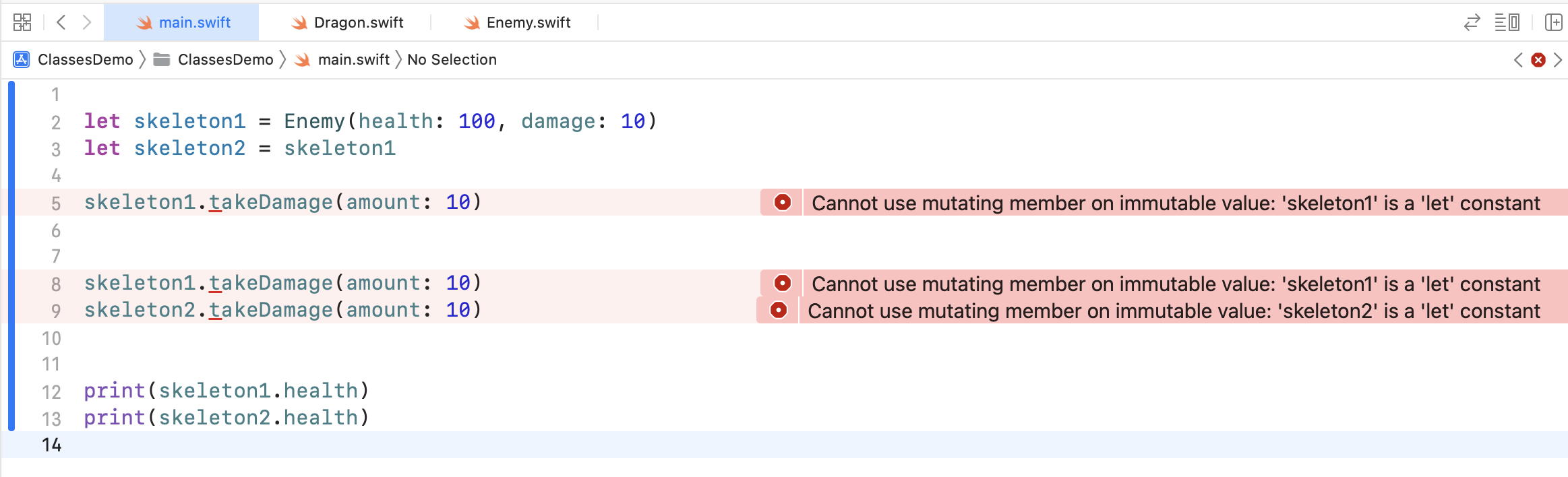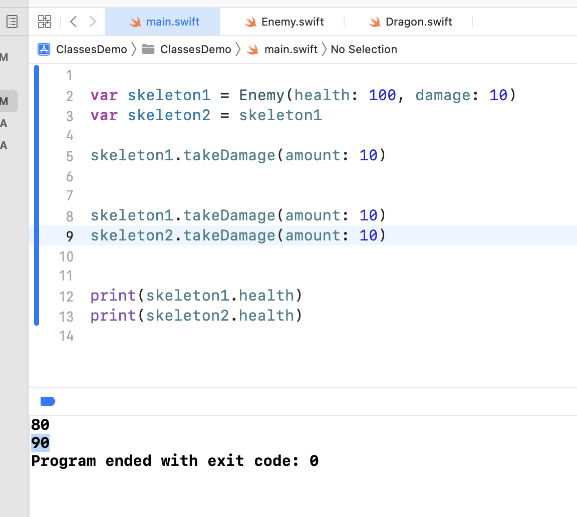 | class Enemy { // properties varhealth: Int vardamage: Int init(health: Int, damage: Int) { self.health= health self.damage= damage } // functions (methods) func takeDamage(amount: Int) { health= health- amount } funcmove() { print("Walk forwards.") } funcattack() { print("Land a hit, does \(damage)damage.") } } |